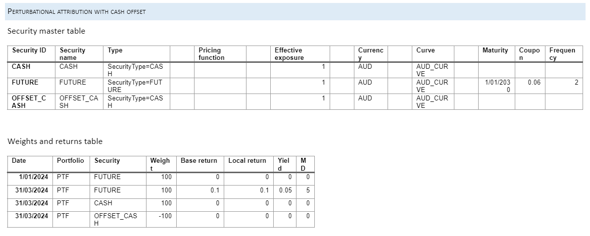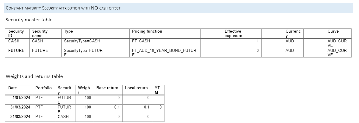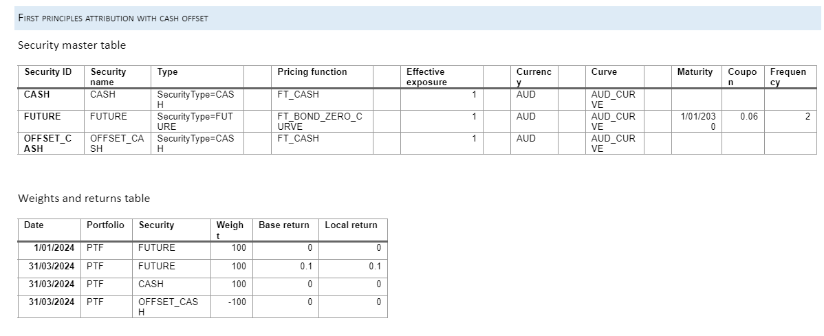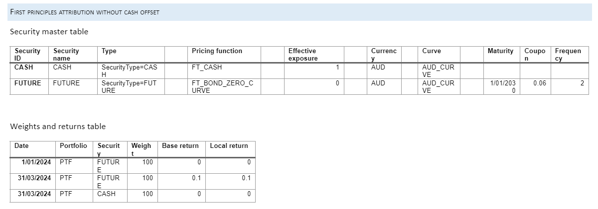 As this example uses first principles attribution, pricing functions are supplied for each security and no risk numbers are supplied in the weights and returns table. Maturity, coupon and frequency are provided for the bond instrument, which should be those of the current CTD for the futures contract. All effective exposures are set to 1 and a cash offset, with weight equal and opposite to that of the bond instrument, is supplied.