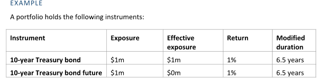 The inclusion of the bond future has leveraged the return and risk of the portfolio. In this case, the return and the modified duration are doubled.